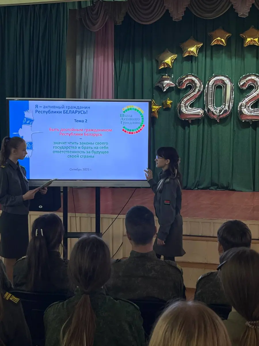23 октября 2025 года в рамках информационно-образовательного проекта "Школа Активного Гражданина" в 8-11 классах прошел информационный час "Быть достойным гражданином Республики Беларусь – значит чтить законы своего государства и брать на себя ответственность за будущую судьбу своей страны". Гостем мероприятия стала Гаро Дарья Владимировна, председатель Молодежного парламента при Борисовском районном совете депутатов. В ходе мероприятия были обсуждены изменения в Конституцию Республики Беларусь, права и обязанности Президента Республики Беларусь, полномочия Всебелорусского народного собрания, разделение власти в нашем государстве, а также вопросы, за что награждают государственными наградами и государственными премиями Республики Беларусь. Беседа получилась очень интересной и активной; ребята задавали вопросы и делились своими знаниями.